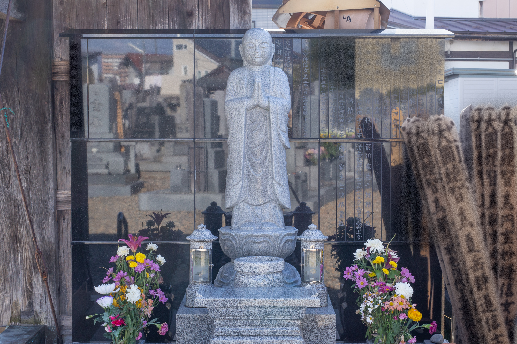 真偽のほどは不明だが、昔このお地蔵さんは大慈寺にあった。時の大慈寺住職が賭博に負け、その金を払うため城下の三州屋という質屋に入れた。それを買い上げようとした人があり、馬に乗せて帰ろうとしたが、馬は歩こうとしなかったので、やむなく三州屋に戻した。その後川村勘之助という人が元利を払い買い受け、馬のあゆむままにしたら当寺に着いたとのことである。河村氏他有志のものが台座を新調し寄進。現在、位牌堂に安置している。